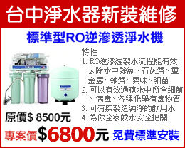 | 台中熱水器維修電熱水器修理電能熱水爐 ∣熱水器 電熱水器台中縣大里/太平市熱水器服務站,維修服務 大台中市熱水器修理維修淨水器 0800-299-919 台中飲水機修理維修、熱水器維修、熱水器修理、淨水器、瓦斯爐、禾豐廚具維修熱水器淨水器飲水機修理台中經銷服務 水塔給水加壓改修工程 熱水器修理維修 " 台中熱水器維修、台中瓦斯爐修理、台中排油煙機維修腸病毒特報,台中熱水器修理、淨水器、瓦斯爐、排油煙機專賣店 04-24510289 分類:RO純水機 |